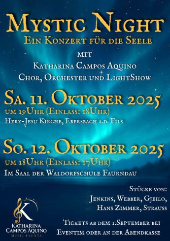 „Mystic Night“ ist ein „Konzert für die Seele“, das Chor- und Orchestermusik mit einer Lightshow verbindet. Unter der Leitung von Katharina Campos Aquino werden Werke von Jenkins, Webber, Gjeilo, Hans Zimmer und Strauss auf mitreißende Weise zu Gehör gebracht.