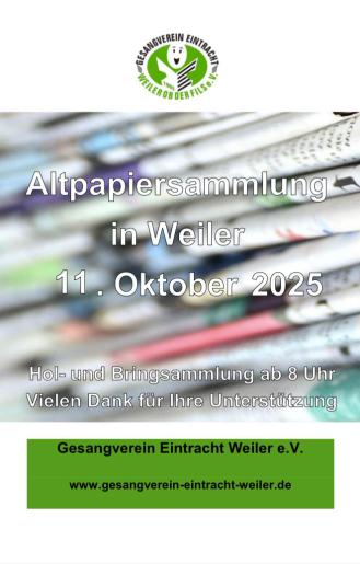Der Gesangverein „Eintracht Weiler“ führt am Samstag, dem 11.10.2025, eine Altpapiersammlung in Weiler durch. Bitte stellen Sie Ihre Papierspende einfach ab 8.30 Uhr an die Straße, damit wir das Papier etwa ab 9.00 Uhr einsammeln können. Zudem kann es bis etwa 12 Uhr auch direkt am Container beim Feuerwehrmagazin abgestellt werden. Bitte nicht selbst in den Container einladen!