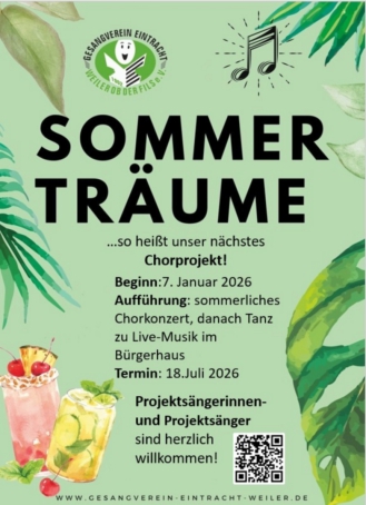 Für unser Konzert am 18. Juli 2026 proben wir eine vielseitige Mischung aus Chormusik verschiedener Genres und Zeiten, vorzugsweise aus den Bereichen Pop und Filmmusik. Im Anschluss an unser Chorkonzert Tanz zu Livemusik und ein entspanntes Sommerfest im Garten des Bürgerhauses in Weiler.