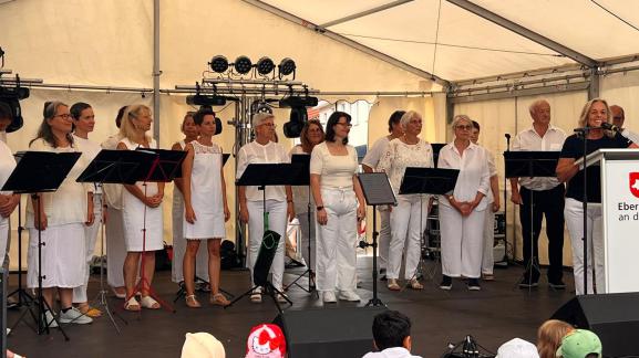 Nach unserem gigantischen Erfolgskonzert am ersten Juliwochenende -in enger Kooperation mit dem TGV Chor Roßwälden -wurde uns am Samstag die Ehre zuteil, mit unseren Songs das Festprogramm des 45. Ebersbacher Stadtfestes eröffnen zu dürfen. Ganz in weiß und in Feierlaune gaben wir – „mit viel Verve und sichtbarer Lust am Gesang“, so die NWZ, mit unseren Songs „Happy“, „You´re the Voice“ und “This is me“ offenbar ein gutes Bild ab. Nach und nach gesellten sich immer mehr Zuhörer*innen zu uns, von denen wir viel Lob einheimsten. Auch die Organisatoren des Stadtfestes waren von unserem Auftritt begeistert und erwirkten für uns einen Extra-Applaus! Großen Anteil an unserm Erfolg hatten einige Sängerinnen aus dem TGV Chor Roßwälden, wir danken euch sehr für eure Unterstützung und für die gute Zusammenarbeit!