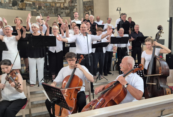 Schon während der letzten Probe kurz vor Konzertbeginn sprang der musikalische Funke auf das Publikum über, das sich an diesem heißen Sommerabend in der Kirche versammelt hatte: Schnell erfüllte sich das Versprechen, das der 1. Vorsitzende des Gesangvereins Eintrachts Weiler, Christian Metzger, im Namen aller Chöre und des Orchesters in seiner zwanglosen Eröffnungsansprache gab: “Wir werden Sie erfrischen!“