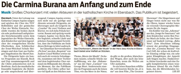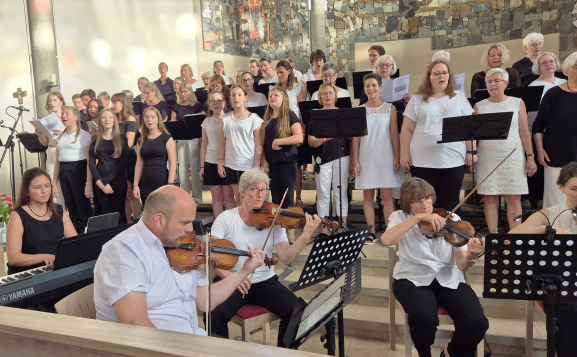 Einen eindrucksvollen Kontrast, jedoch kaum weniger ergreifend, setzten die Chöre innig mit dem Choral „Jesu bleibet meine Freude“ von Johann Sebastian Bach, bevor die Chorleiterin Katharina Campos Aquino und das Orchester mit dem Violinkonzert „Die vier Jahreszeiten. Sommer“ von Antonio Vivaldi in eine ganz anders geartete musikalische Welt entführte. Nicht fröhlich und unbeschwert- spannungsgeladen kommt der Sommer in Vivaldis Werk daher. Mit seinem virtuosen, ausdrucksvollen Spiel machte das Ensemble zerstörerische Winde, Donnergrollen und nervige Fliegenschwärme musikalisch erlebbar.